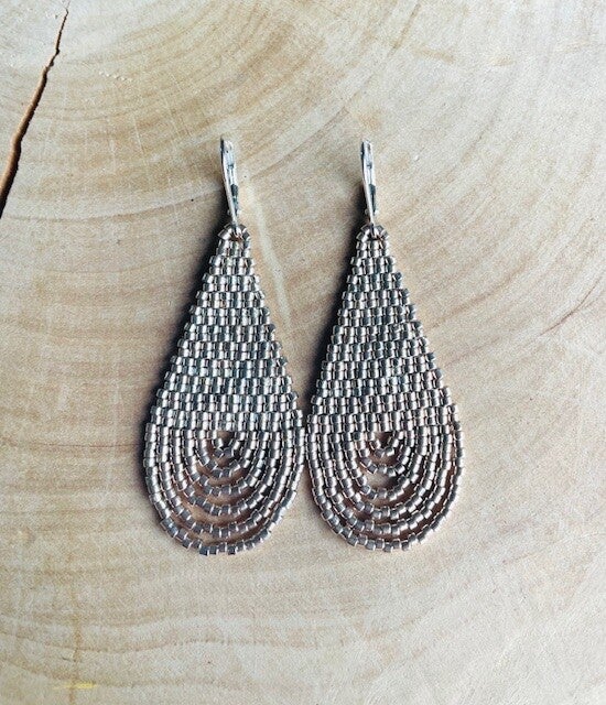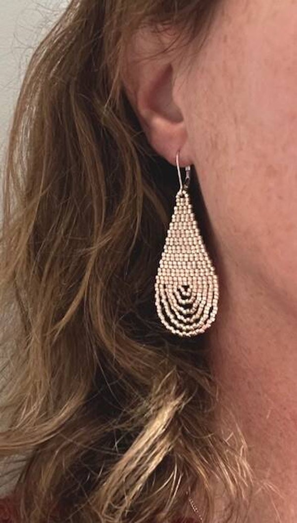 Gemaakt van champagne-gouden Miyuki-kralen, met de hand geweven op zeer sterk draad. De oorbellen zijn bevestigd aan echt zilveren klap-oorbellen (brisuren). Ze zijn 4,5 cm lang en ruim 2 cm breed.
